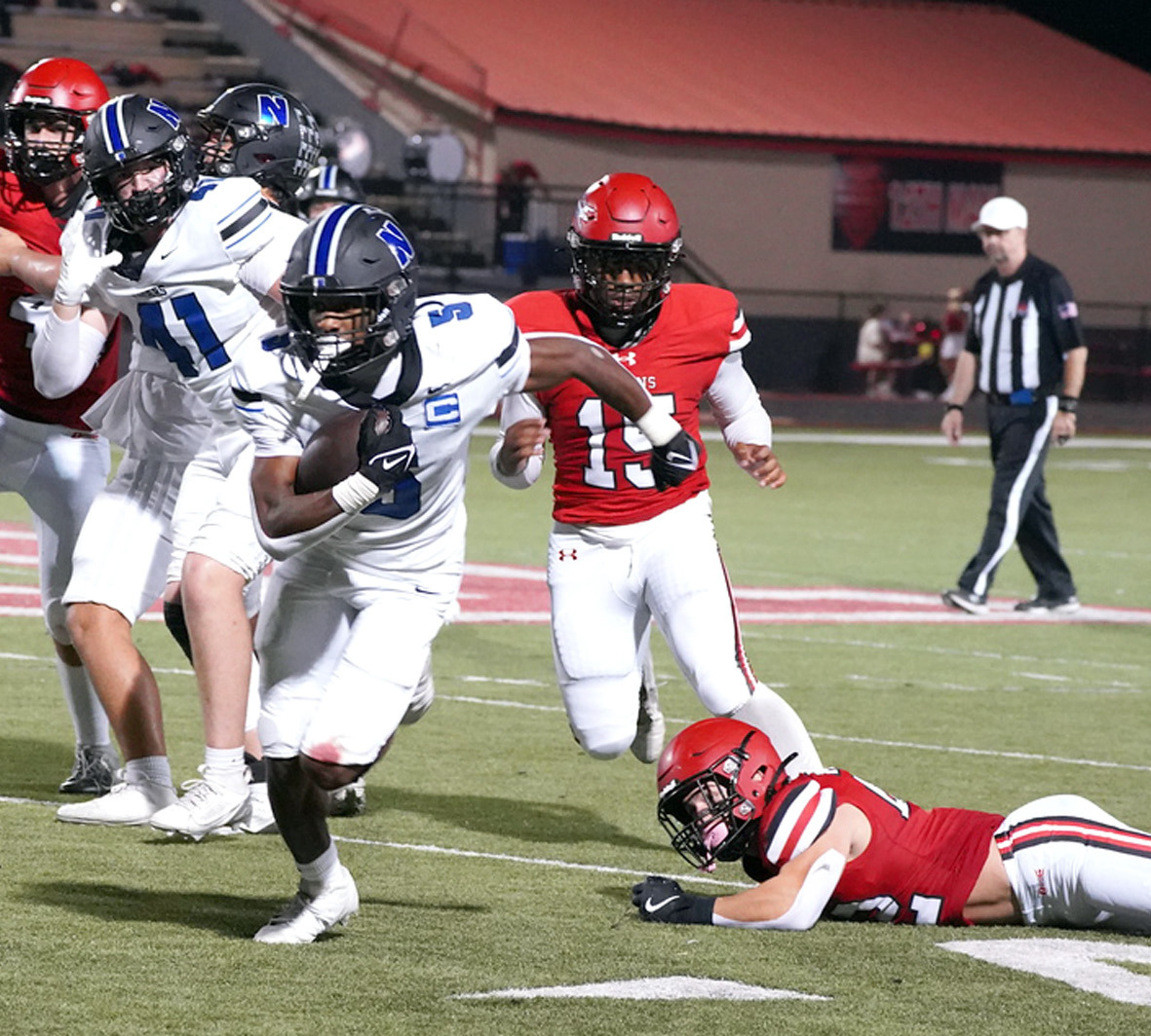 Newcastle scored 31 points in the first half, but the defense allowed 28 points. Head Coach Jeff Brickman said coaches challenged the defense at half time to lower their pad level and control their gaps. He said the players answered the challenge.