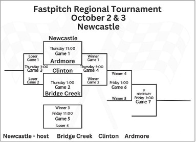 Newcastle hosts the Regional Tournament beginning at 11 a.m. today (Thursday) and concluding Friday. The Racers open play with the 11 a.m. game against Ardmore. Clinton takes on Bridge Creek at 1 p.m. and the winners of the two earlier games will play at 5 p.m. Thursday. Competition continues on Friday with games at 11 a.m., 1 p.m., and if necessary at 3 p.m.