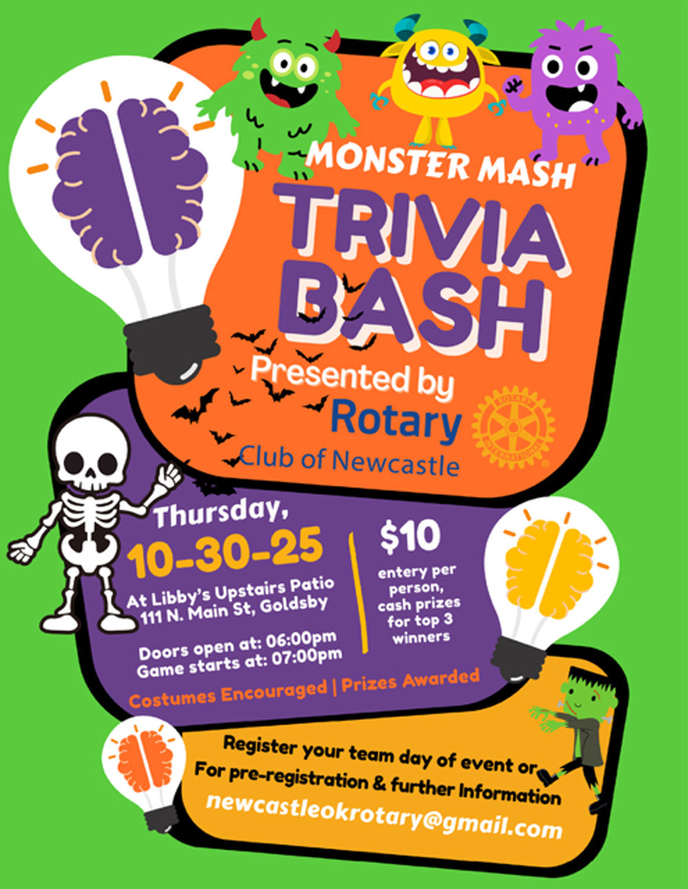 Newcastle Rotary Club International invites the public to play Monster Mash Trivia Bash on Thursday, October 30 at Libby’s in Goldsby. They said wear your costume and share your knowledge.