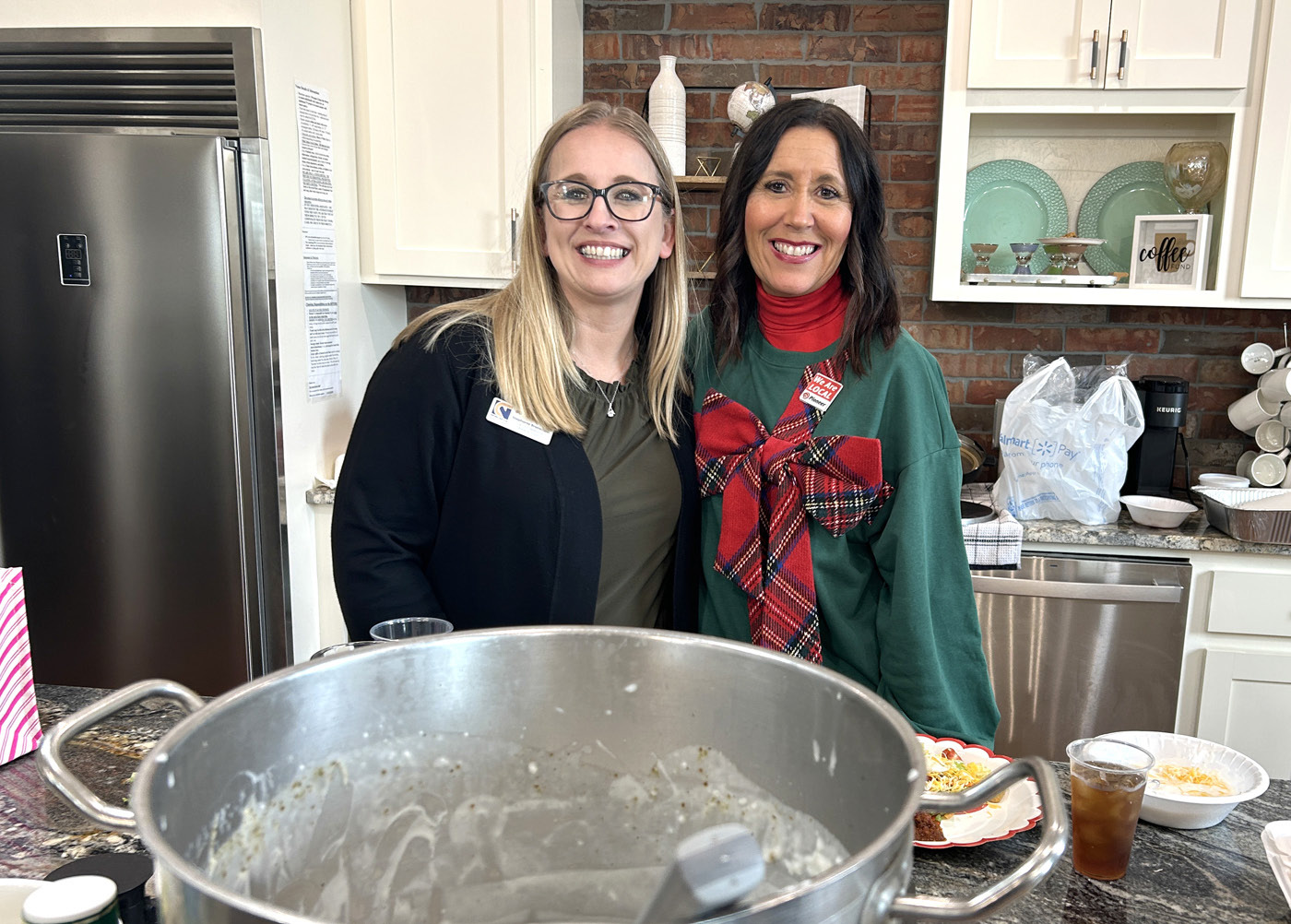 The First National Bank & Trust’s Stephanie Branscum and Pioneer’s Robin Fielder took a short break from their volunteer work at the Multi-Chamber Partnership Christmas Party in Blanchard. • photo by Mark Codner