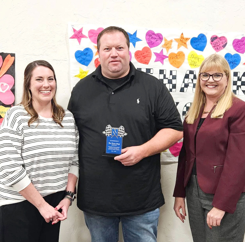 School Resource Officers Braydon Jones, Micah McNew, and Darren Sainz (not pictured) were recognized for keeping the school campuses safe. They are pictured with Jonathan Atchley, Executive Director of Academics at Newcastle Schools. • photo providedRecognized as a Community Partner with Newcastle Public Schools were Gary and Melissa Harwell, owners of The Pizza Shop. They are pictured with Superintendent Dr. Cathy Walker. • photo provided