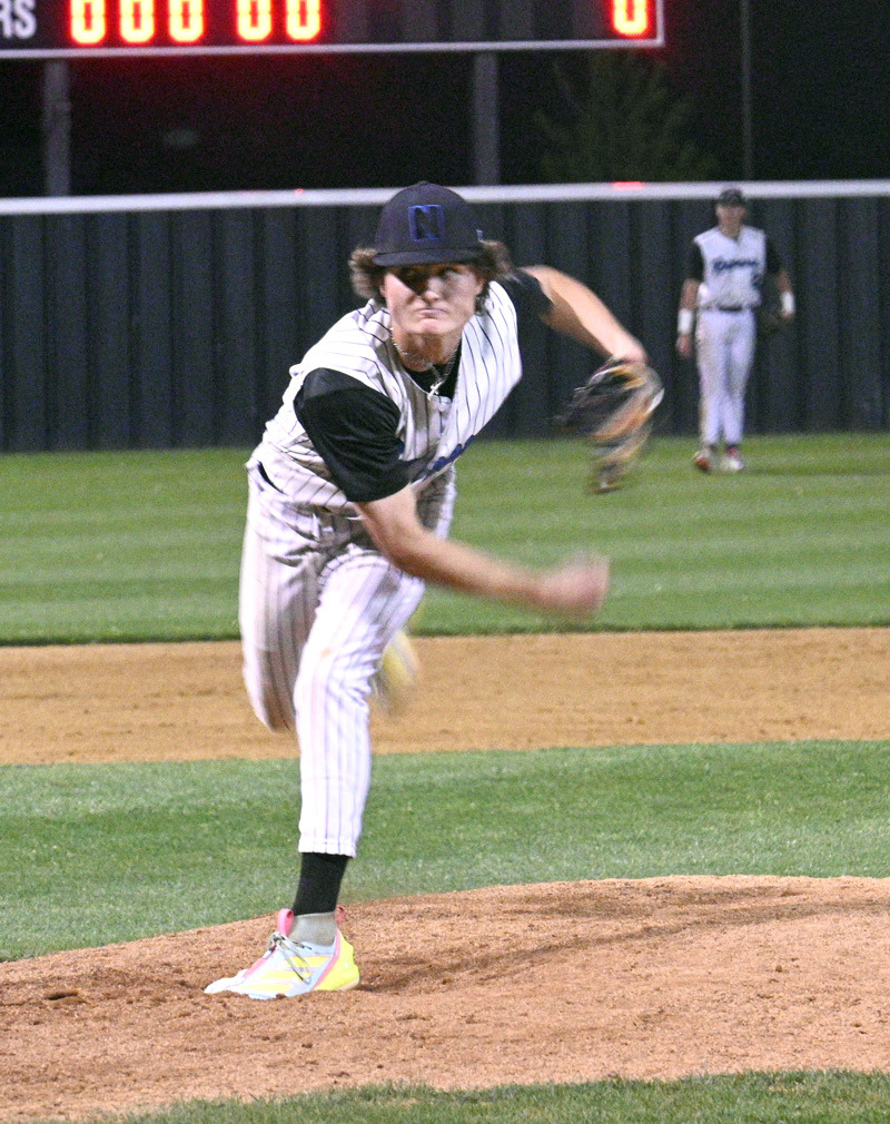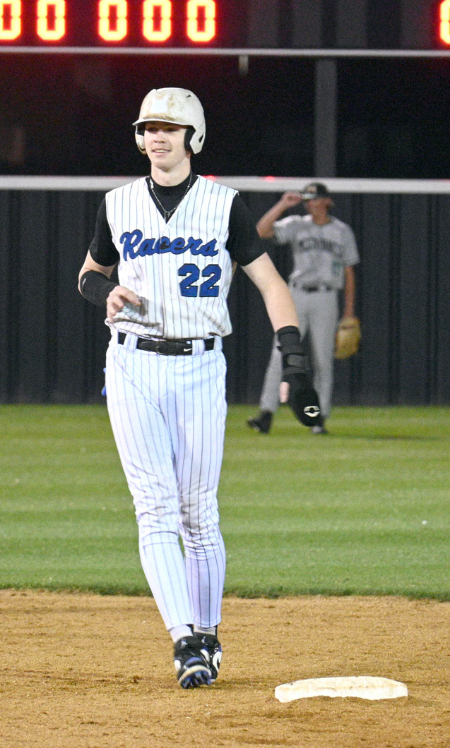 Christian Deloera connects with a ball in recent Racer play. • photo by Lisa Smith-LongmanRyder Gibson throws a pitch for Newcastle during a recent game against Bishop McGuinness High School. • photo by Lisa Smith-LongmanWeston Lightle comes back to second base for Newcastle after making the turn running the bases. • photo by Lisa Smith-Longman